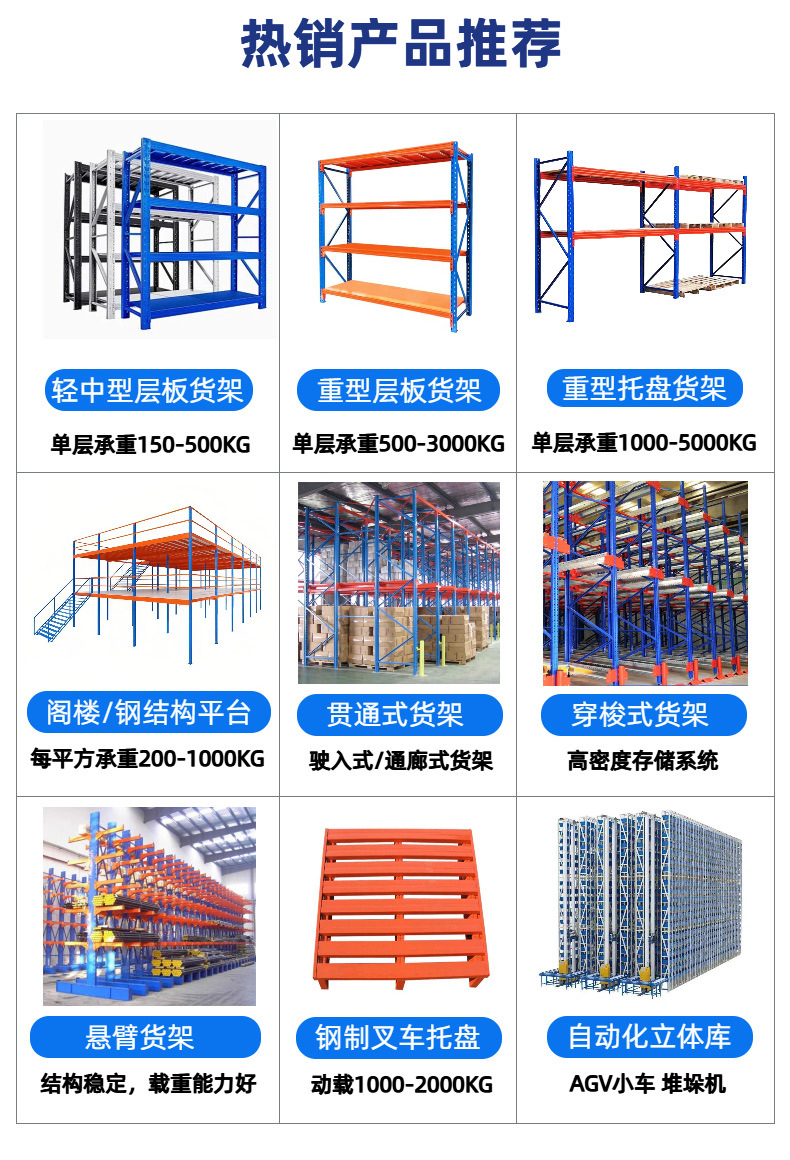 工廠主要生產(chǎn)有:重型貨架,閣樓貨架,鋼結(jié)構(gòu)平臺,橫梁式貨架,模具貨架,懸臂貨架,流利式貨架,駛?cè)胧截浖艿认嚓P(guān)物流設(shè)備產(chǎn)品。